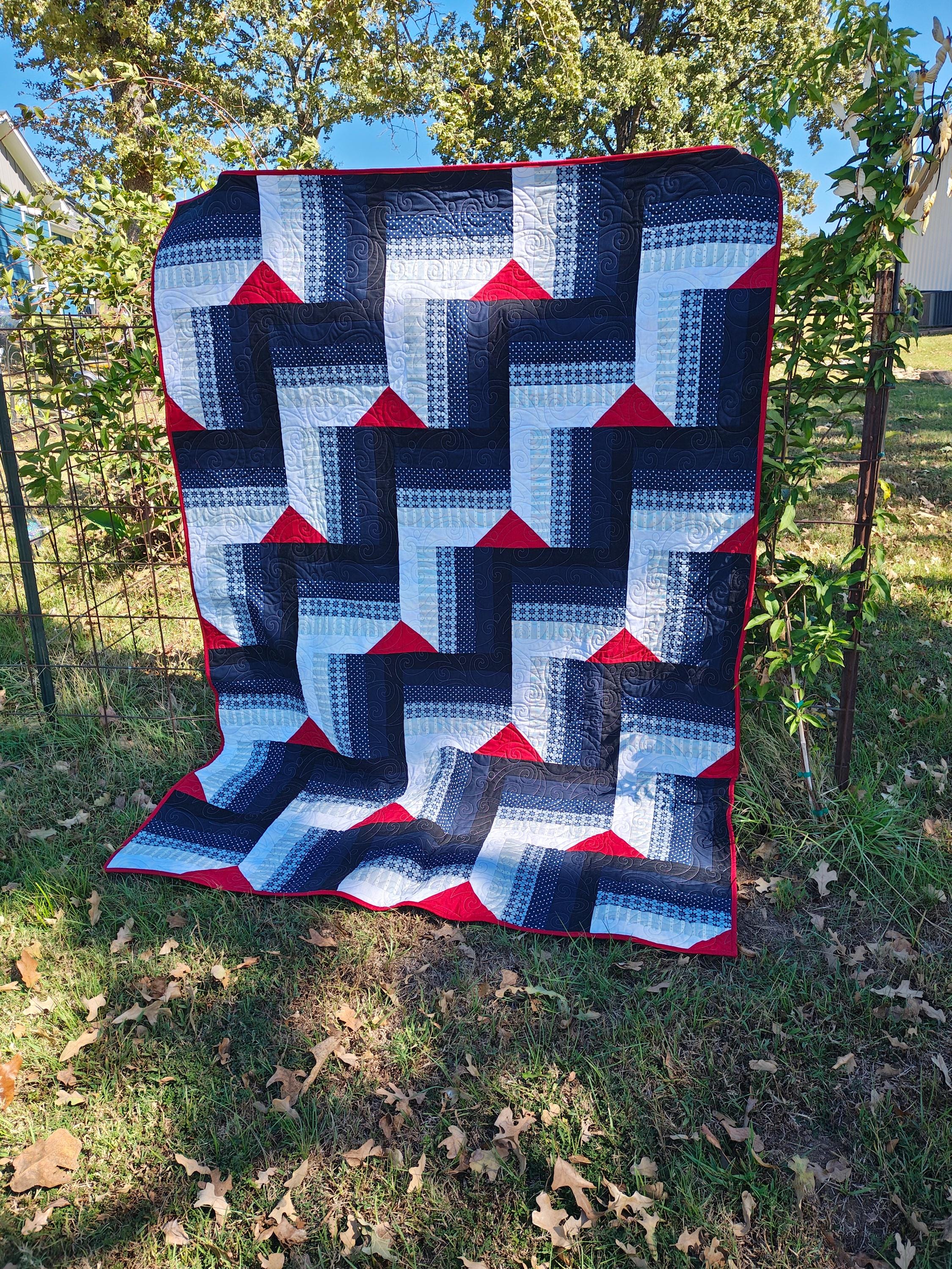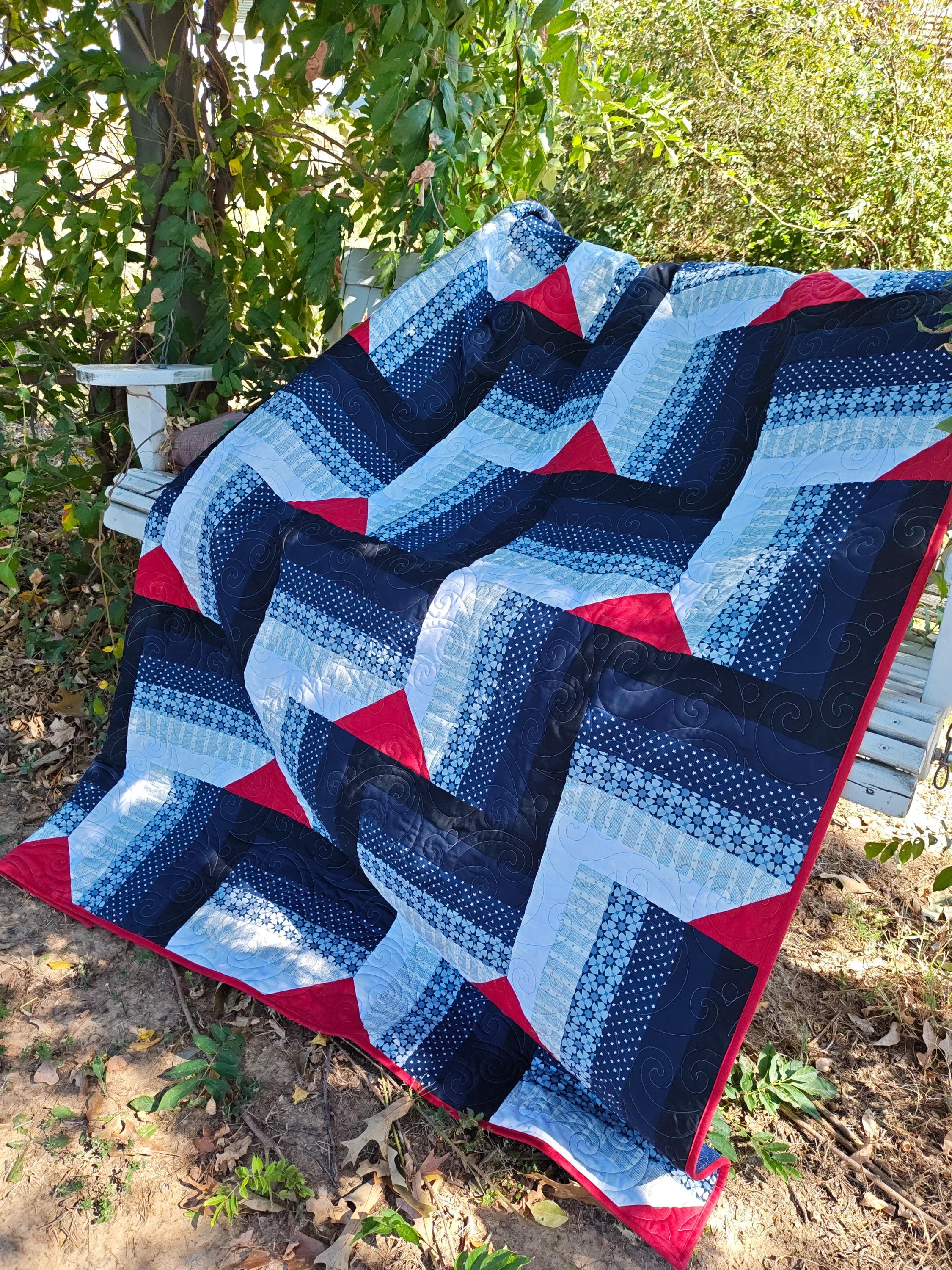 A fun take on a rail fence, using 2 ½” strips and contrasting accents. Easily change the size by adding more blocks!