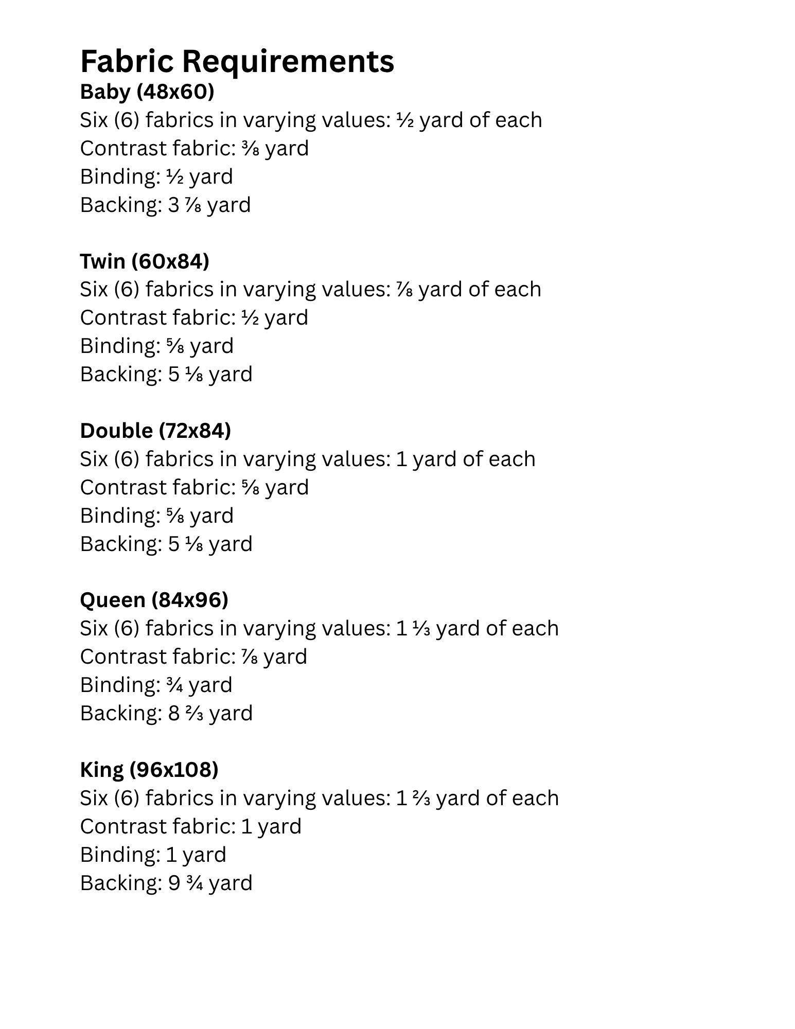 Finished Sizes: Baby (48x60), Twin (60x84), Double (72x84), Queen (84x96), King (96x108)