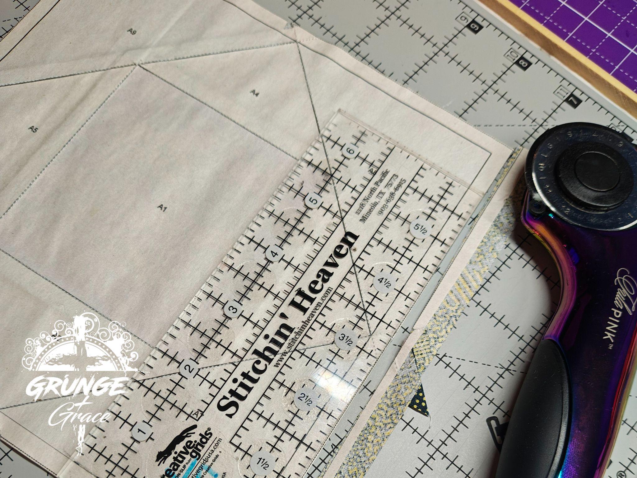 Line up the Add a Quarter Ruler on the edge of your fold template and trim the excess fabric.