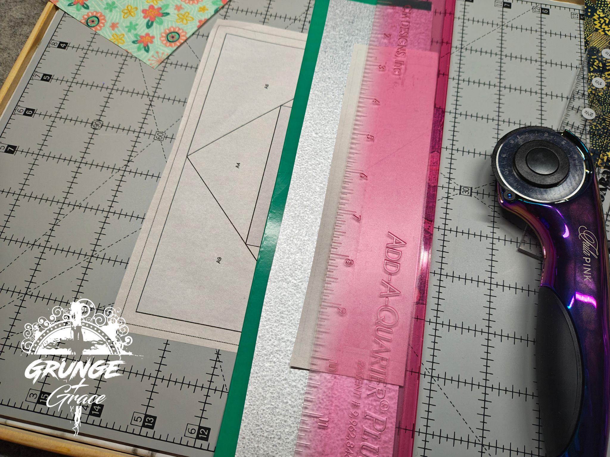 First, your fabric will need to be cut to size. Most patterns will give you either sizes to cut or templates to cut your fabrics from. In this tutorial, I'm making a 7" Economy Block, such as the one I use in my Mystic Wall Hanging pattern.