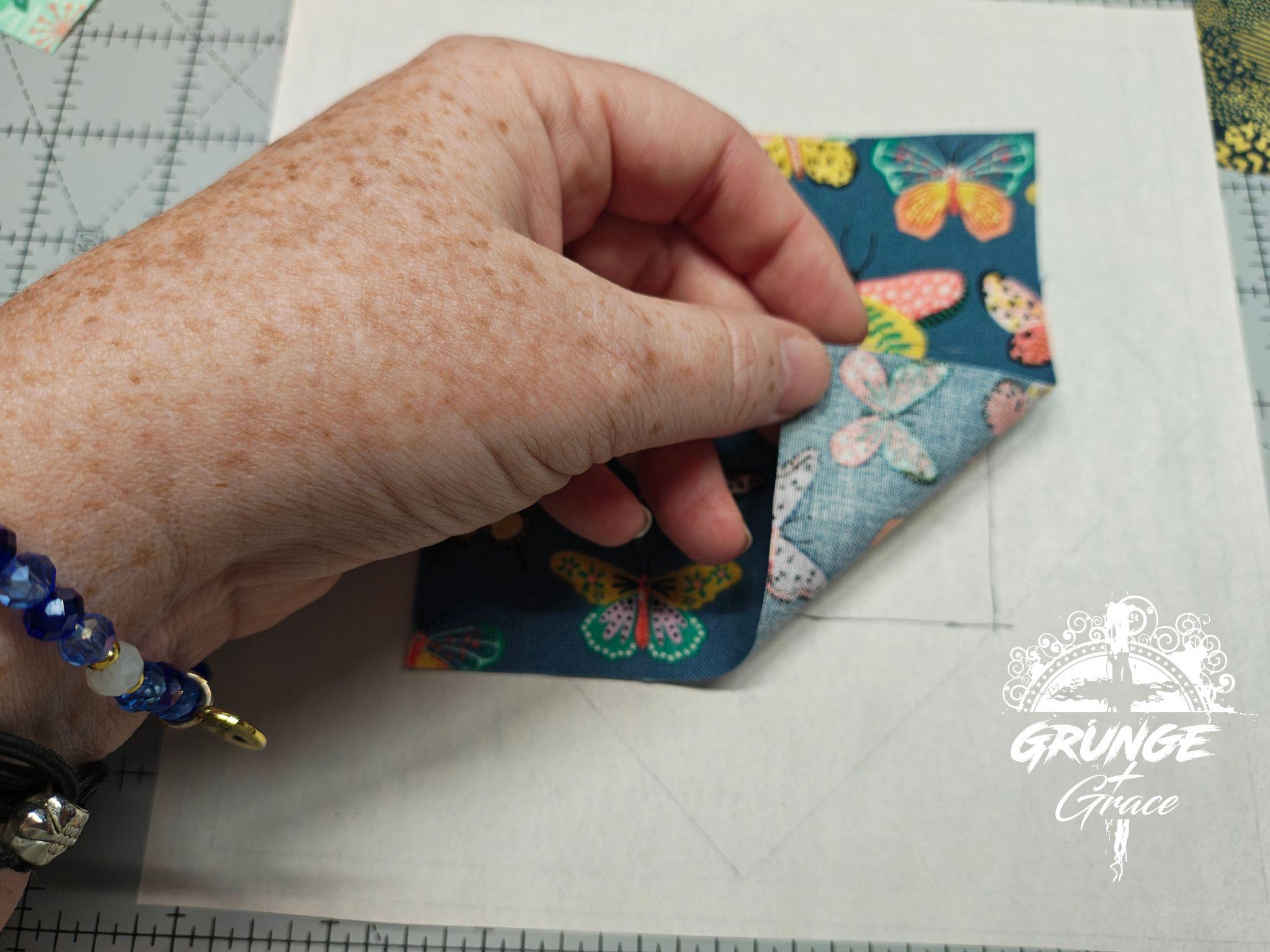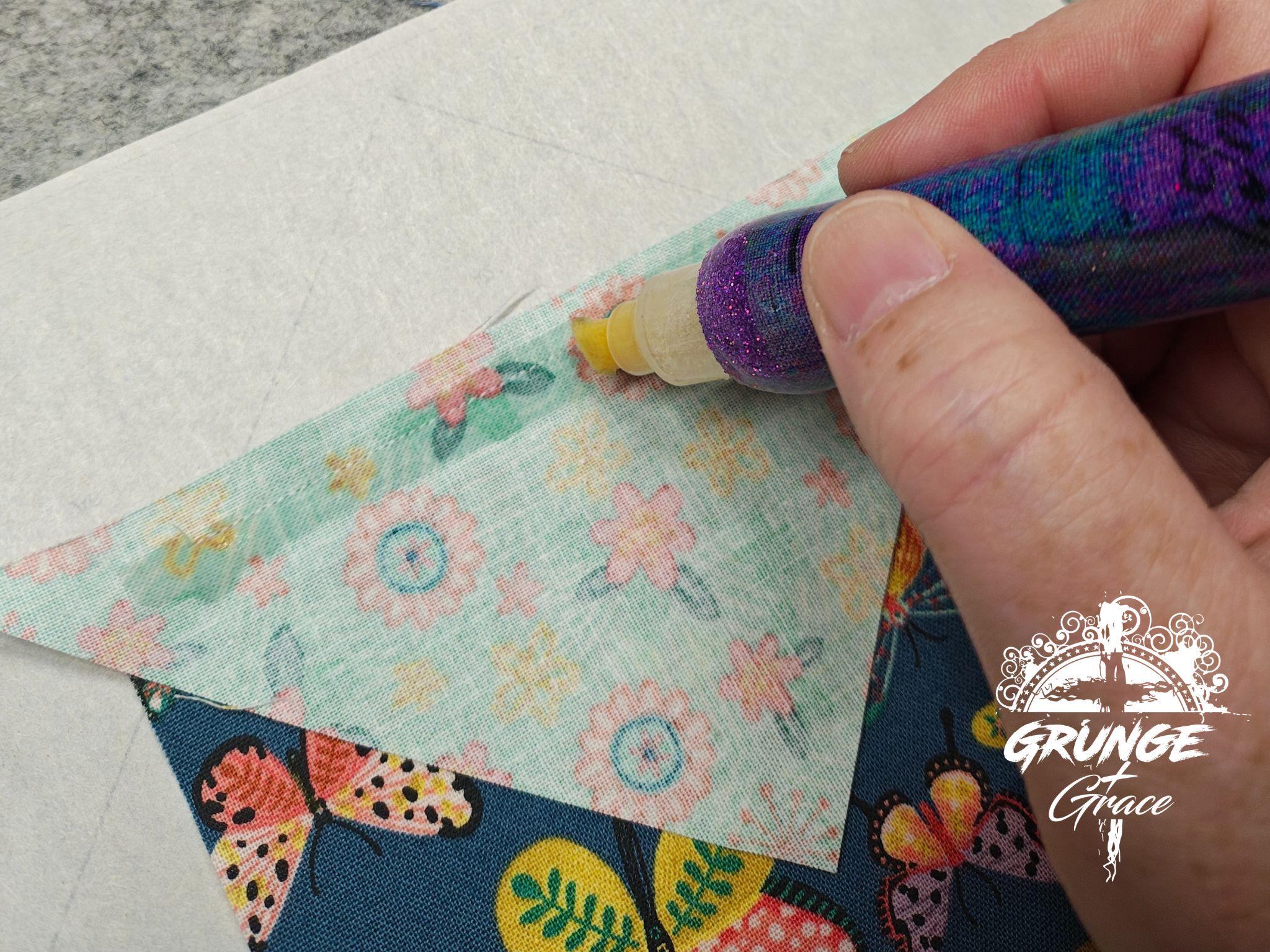 Line up your second fabric along the edge you just trimmed. Make sure that your second fabric will fully cover its section on the foundation paper. This is where the lighted mat comes in handy, being able to see through the fabric and paper to ensure coverage. Use the Sewline Glue Pen to draw a thin line in the seam allowance to hold your fabrics together.