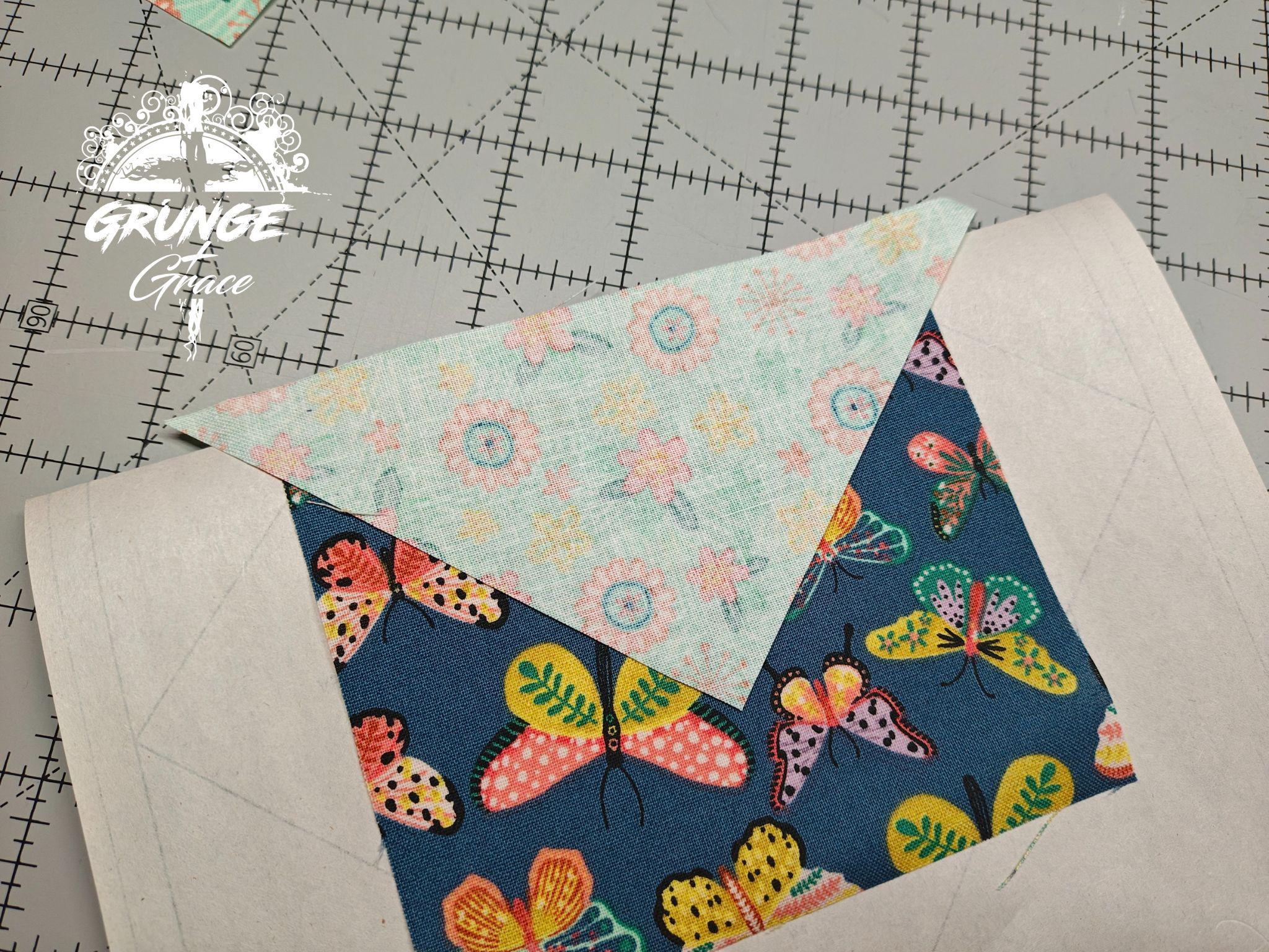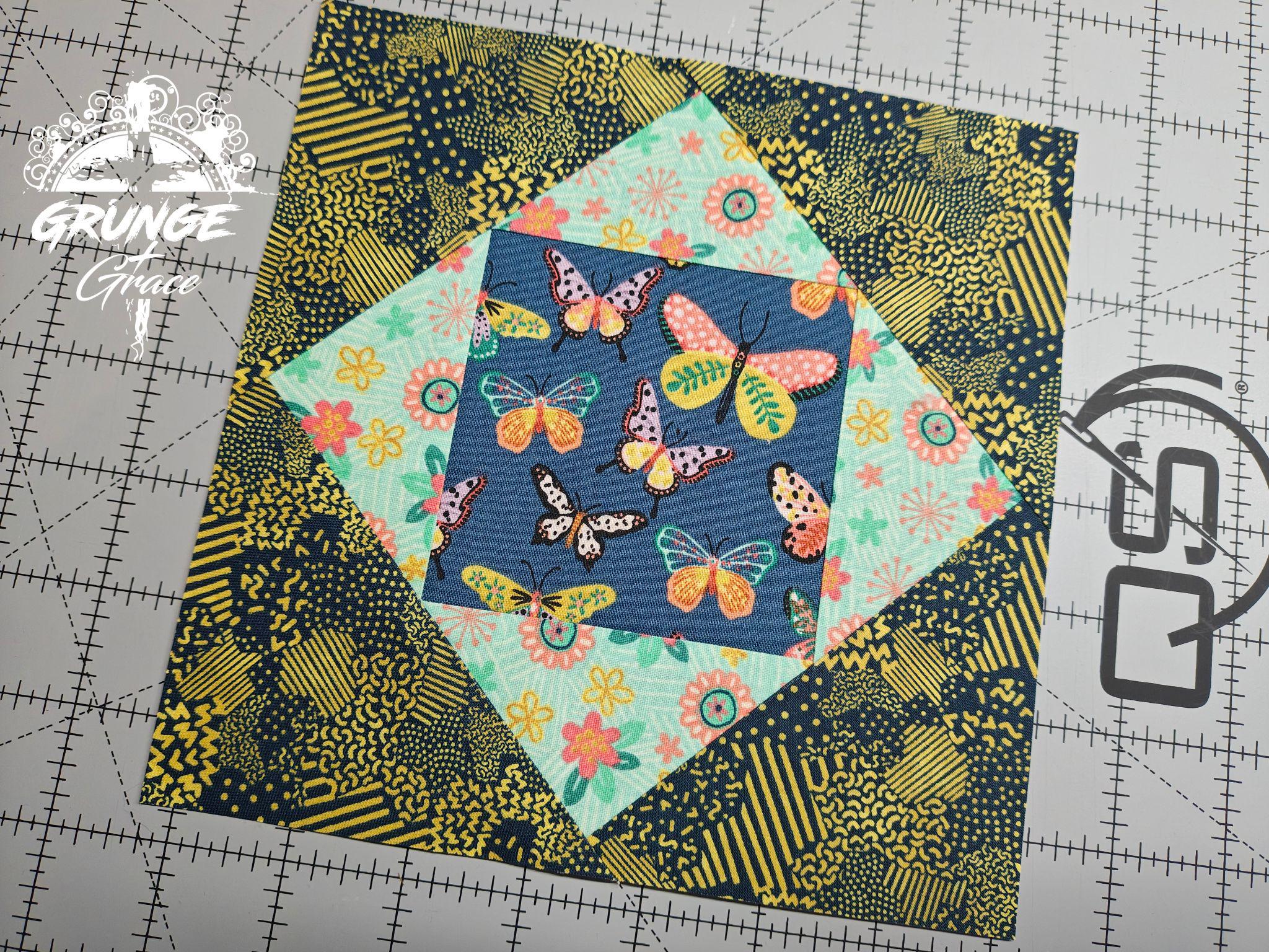 One you've sewn your final section of fabric in place and pressed it, you'll need to trim your block. My blocks all include the seam allowance on the papers, giving you a line to trim on. This block will measure 7.5" unfinished, and will be 7" finished when sewn into a quilt.