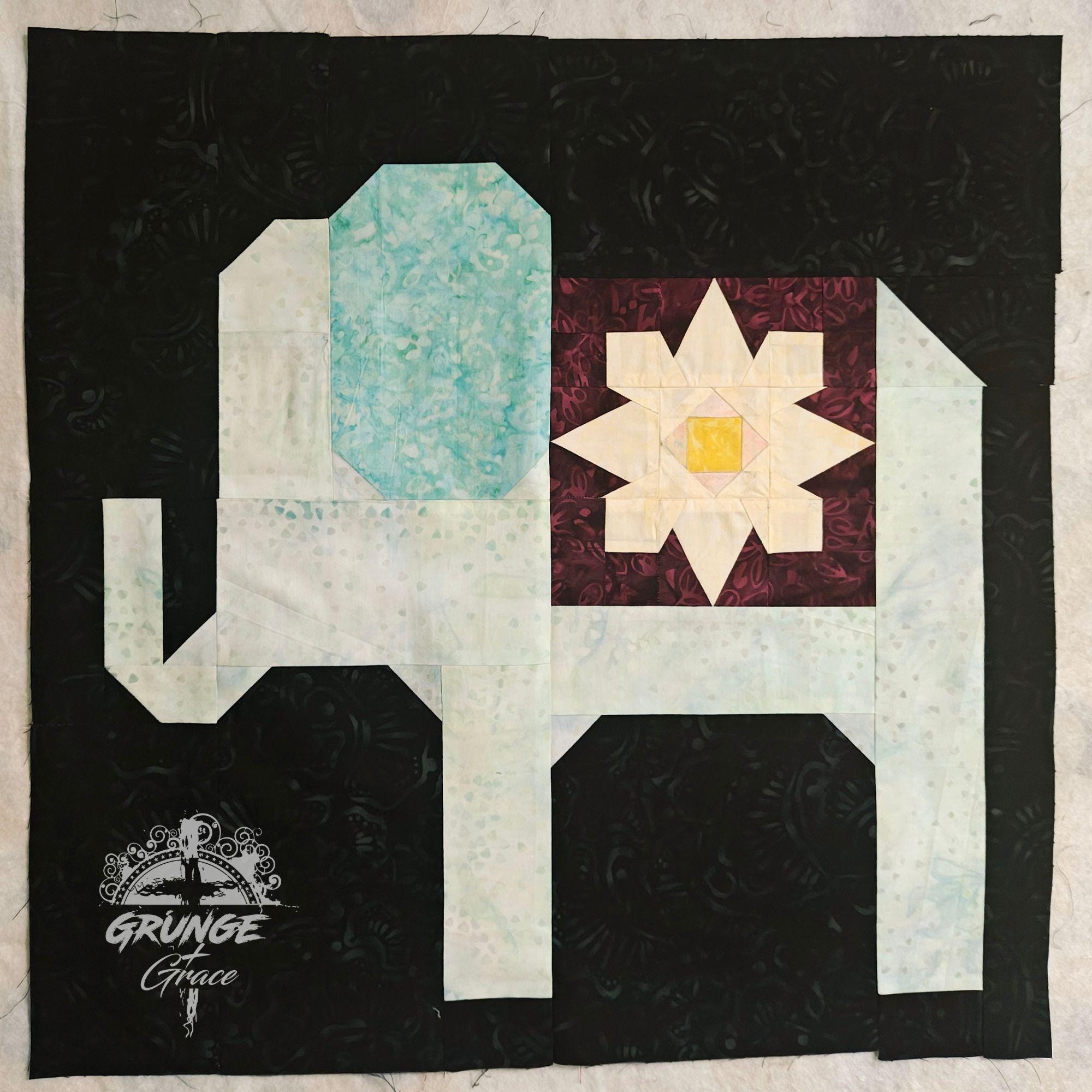 You will also need a small scrap of yellow fabric for the flower center, scraps of cream or white for your flower, and some scraps of your background fabric of choice. You will also need the Elephant Block Pattern, found here.